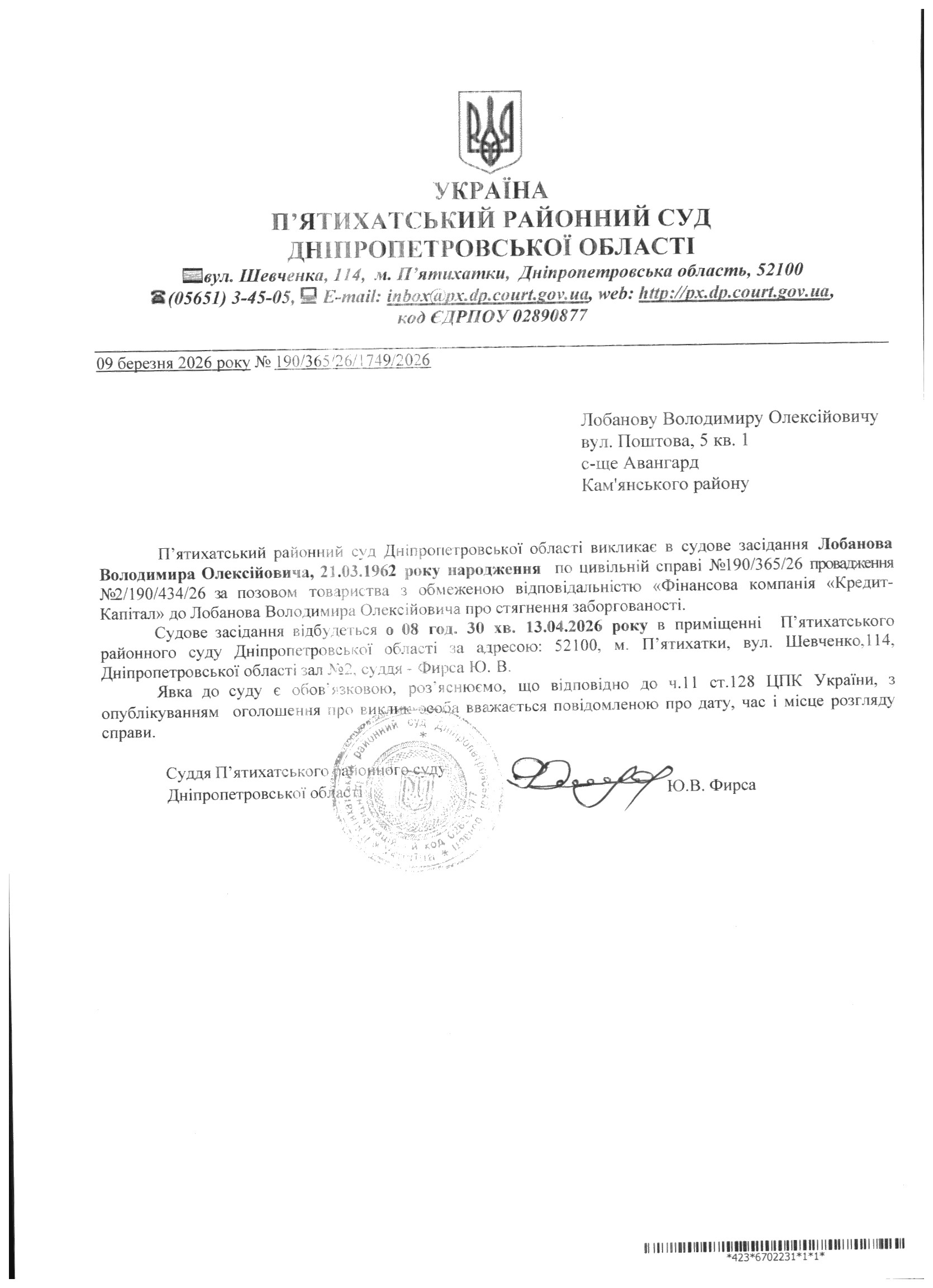 Про виклик в судове засідання Лобанов Володимир Олексійович