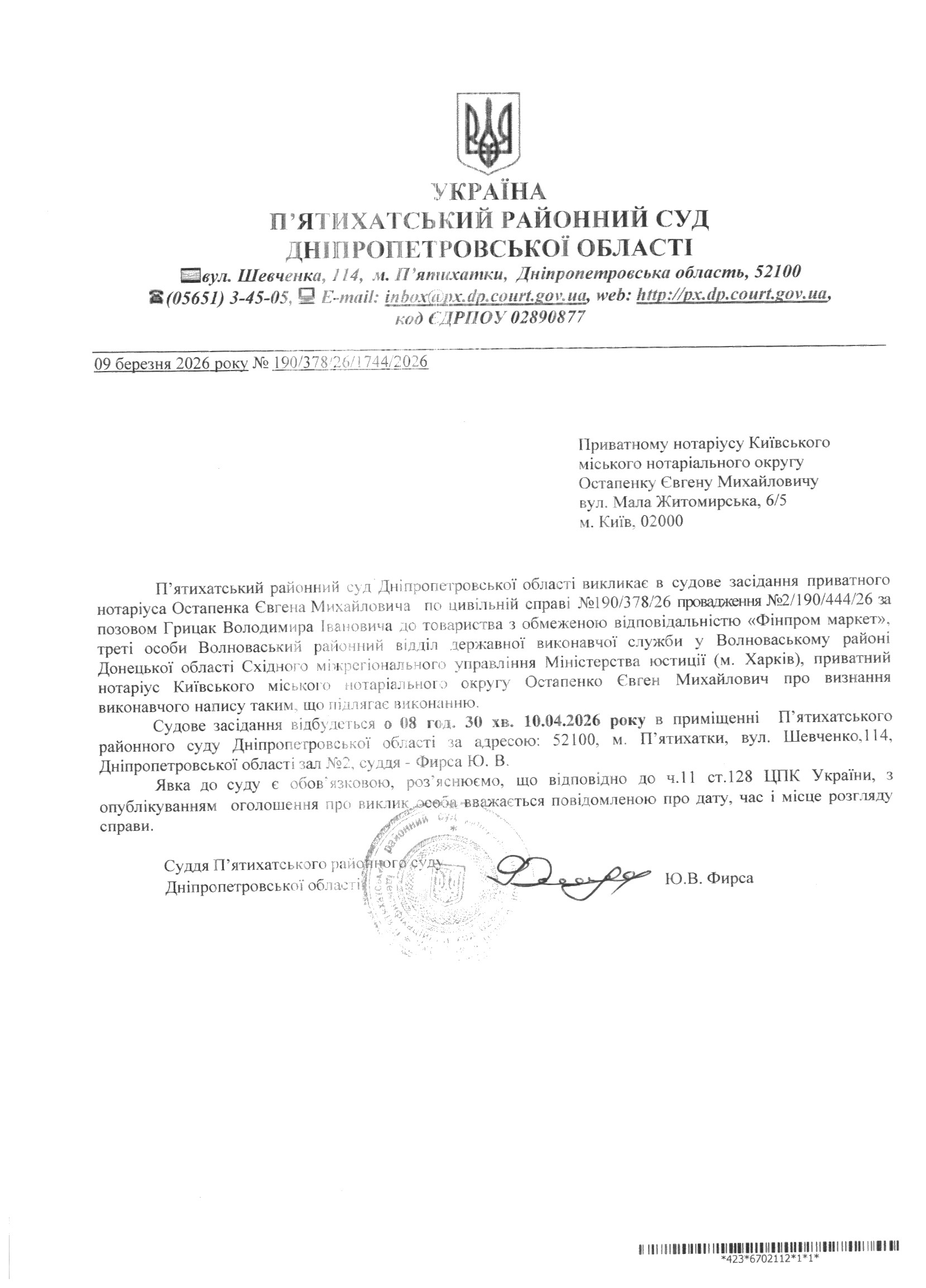 Про виклик в судове засідання приватний нотаріус Остапенко Є.М.