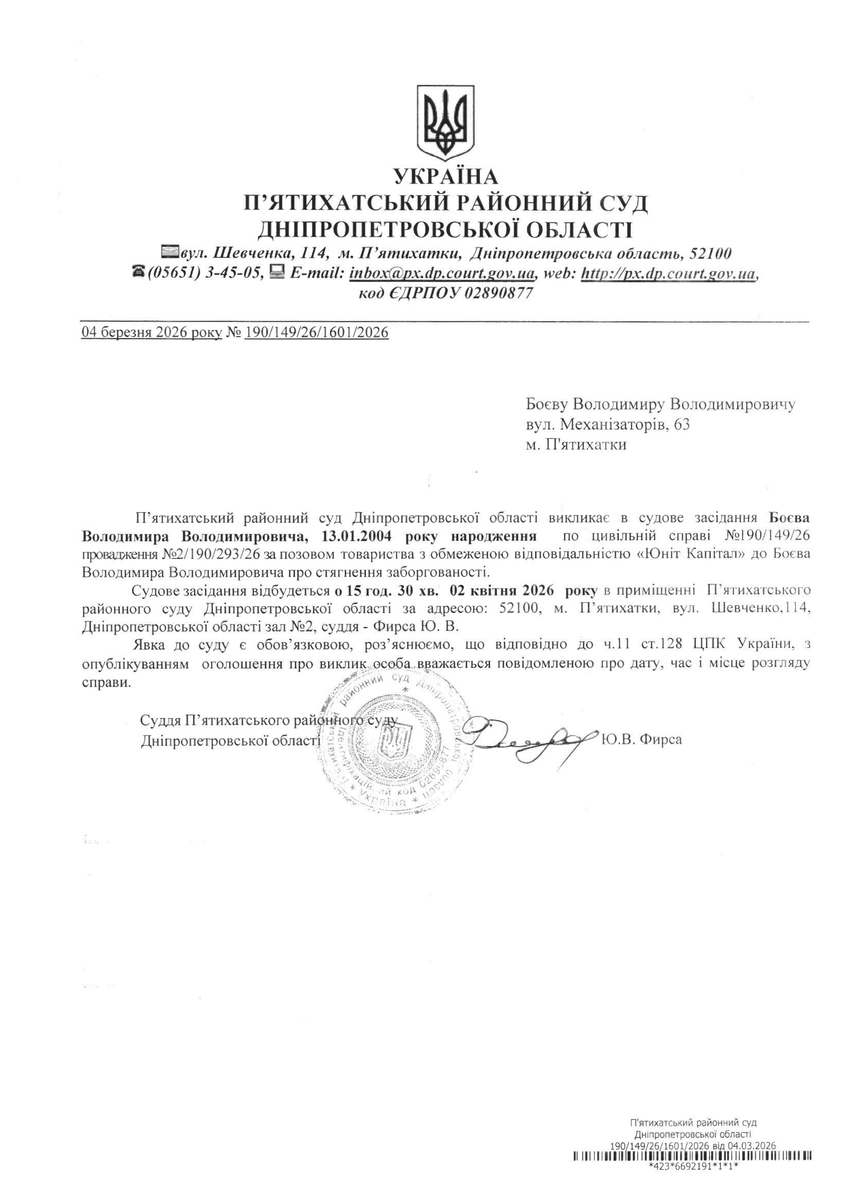 Про виклик в судове засідання Боєв Володимир Володимирович