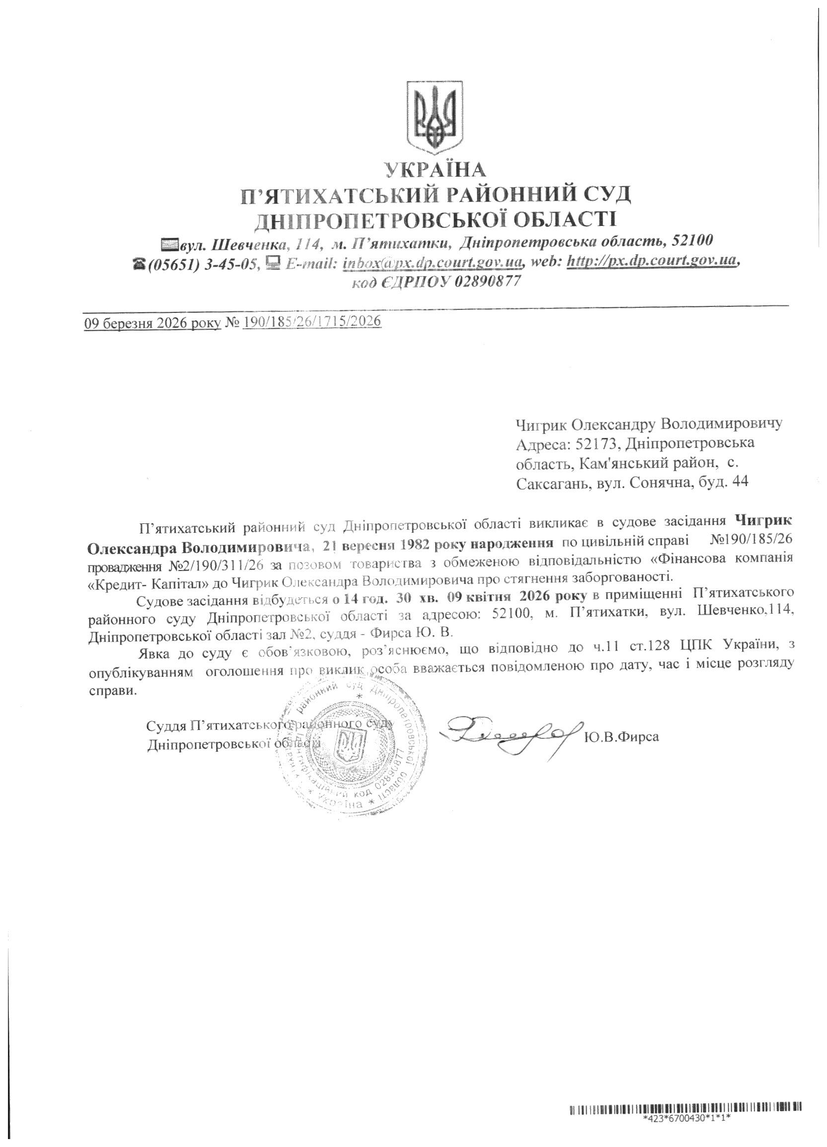 Про виклик в судове засідання Чигрик Олександр Володимирович