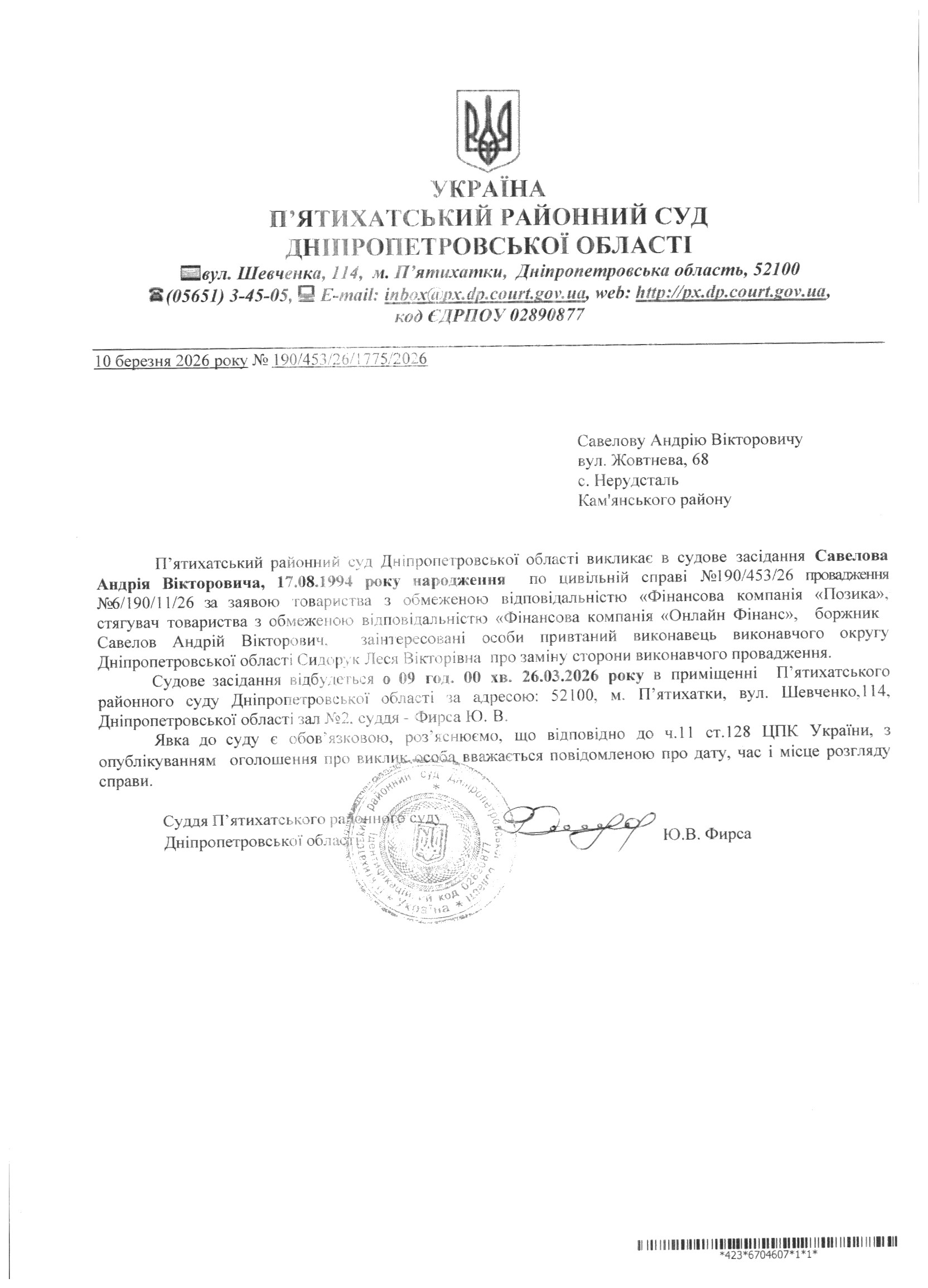 Про виклик в судове засідання Савелов Андрій Вікторович