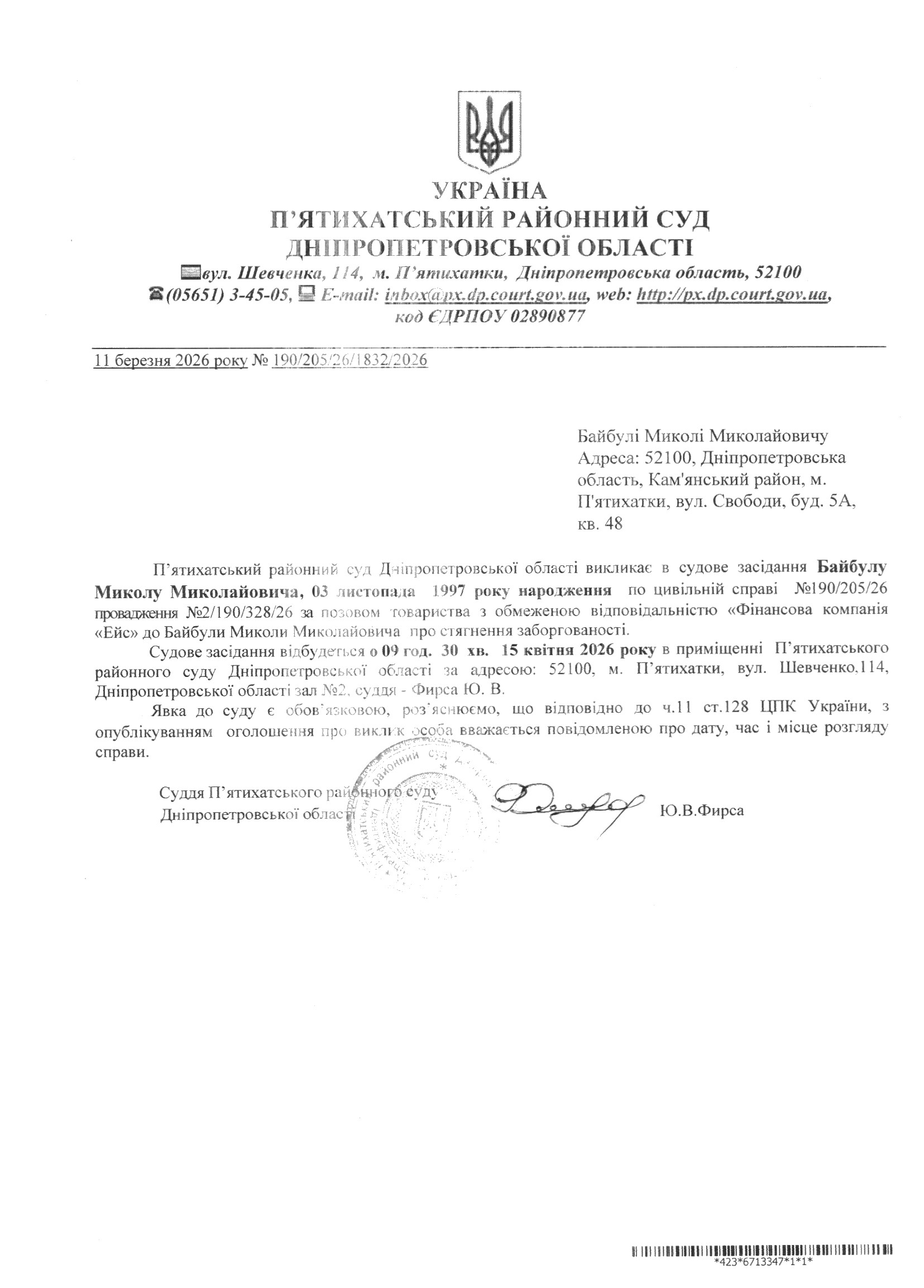 Про виклик в судове засідання Байбула Микола Миколайович