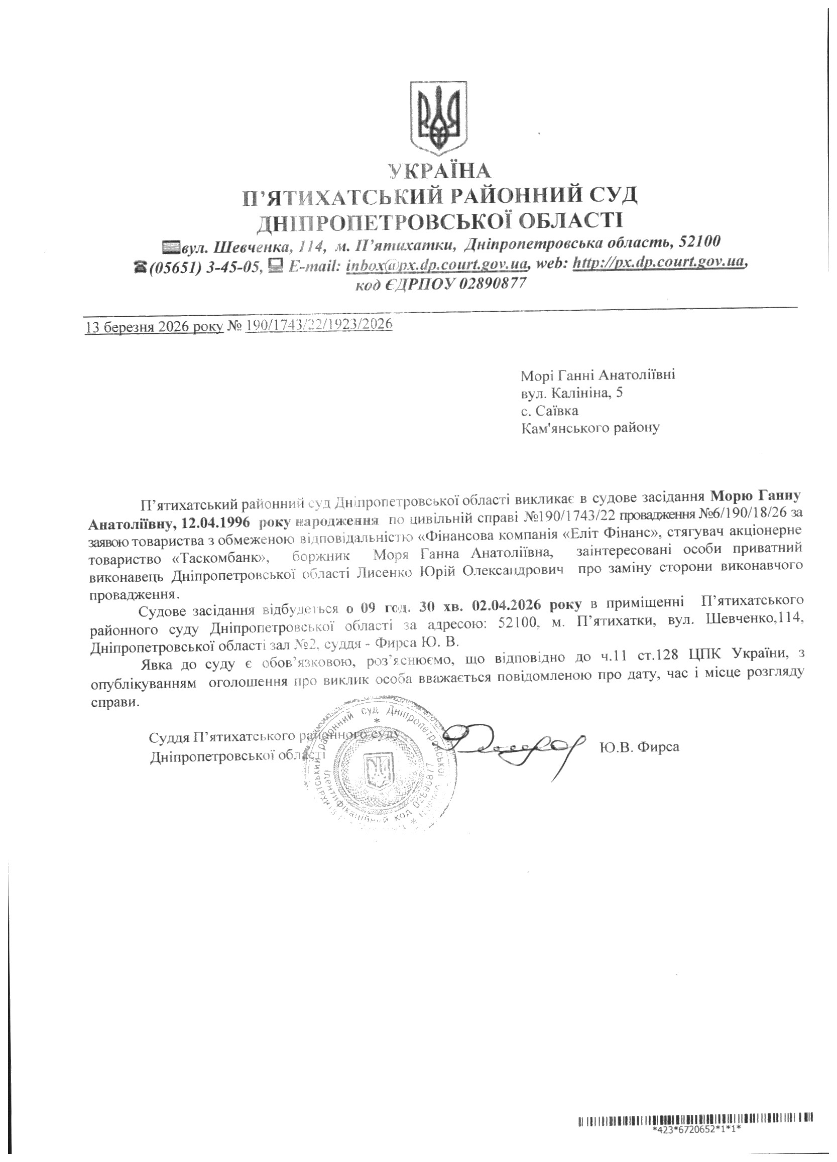 Про виклик в судове засідання Моря Ганна Анатоліївна
