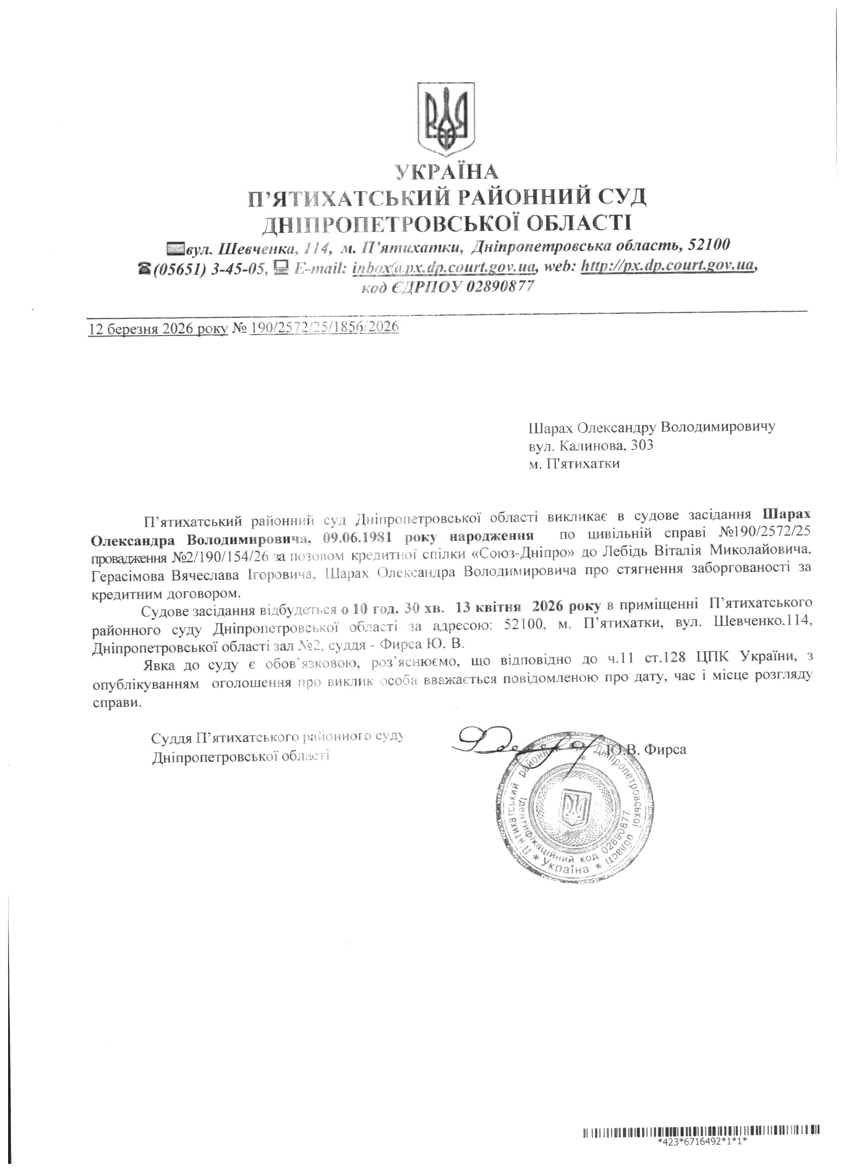 Про виклик в судове засідання Шарах Олександр Володимирович