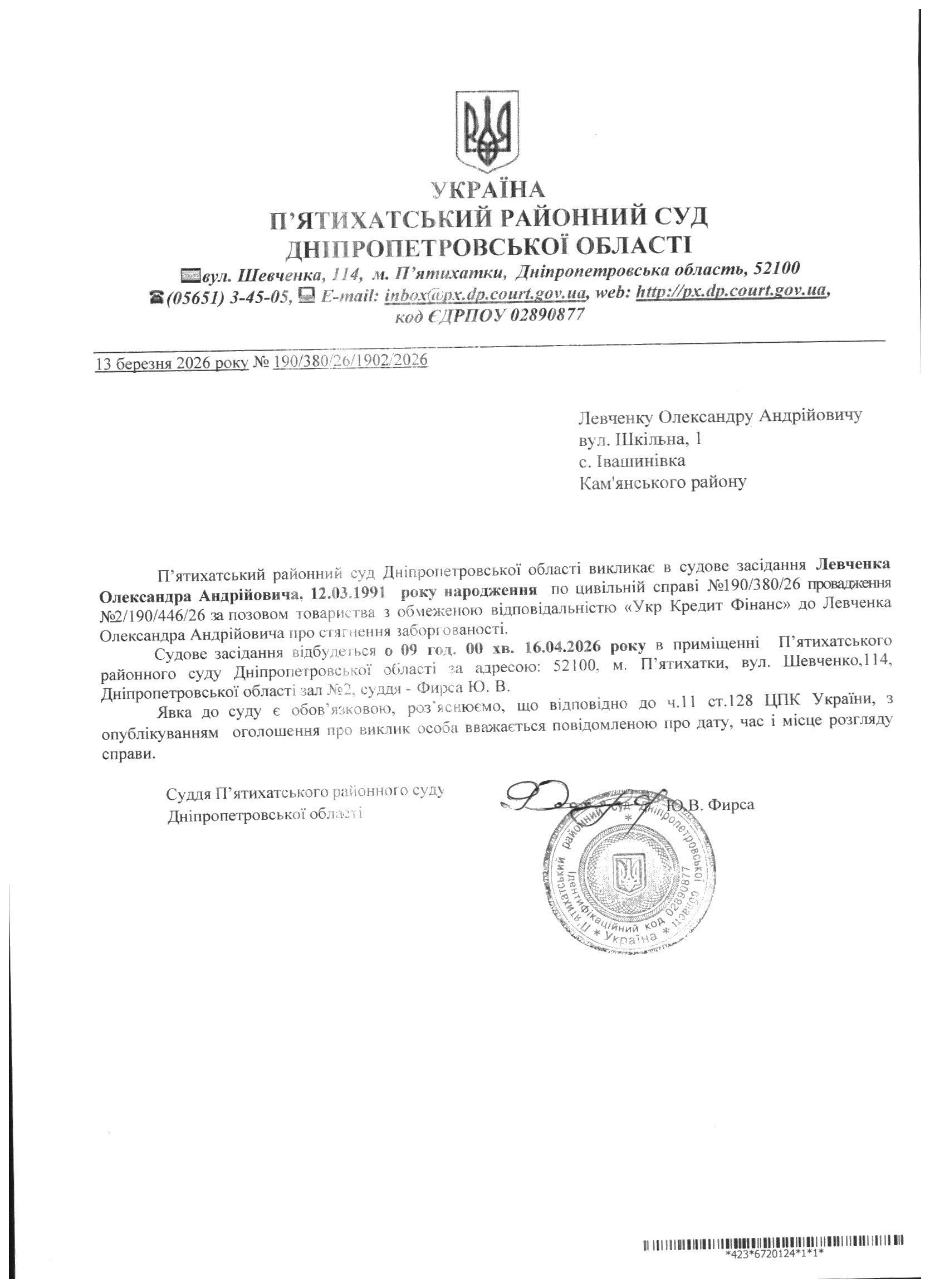 Про виклик в судове засідання Левченко Олександр Андрійович