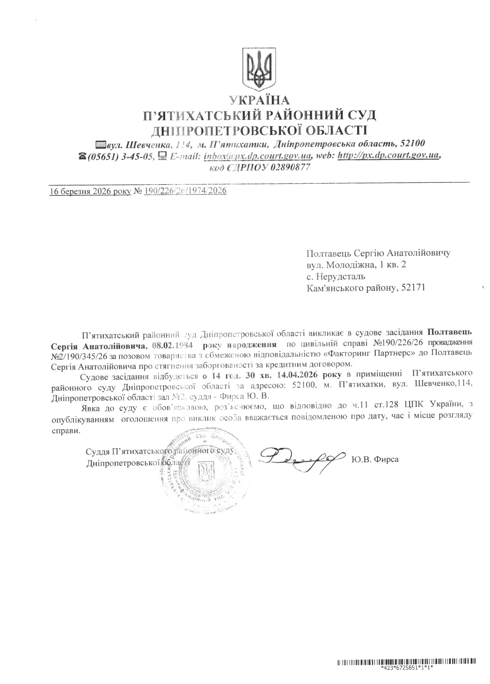 Про виклик в судове засідання Полтавець Сергій Анатолійович