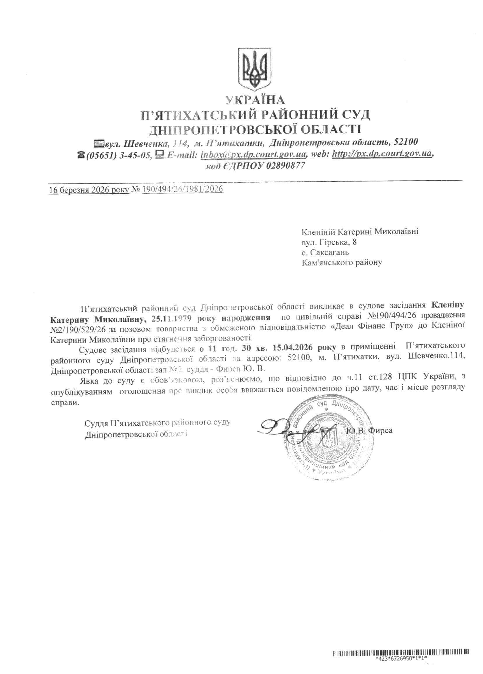 Про виклик в судове засідання Кленіна Катерина Миколаївна