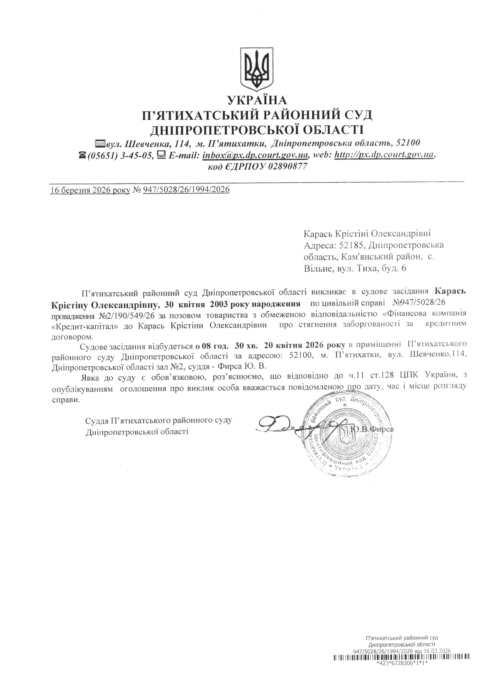 Про виклик в судове засідання Карась Крістіна Олександрівна
