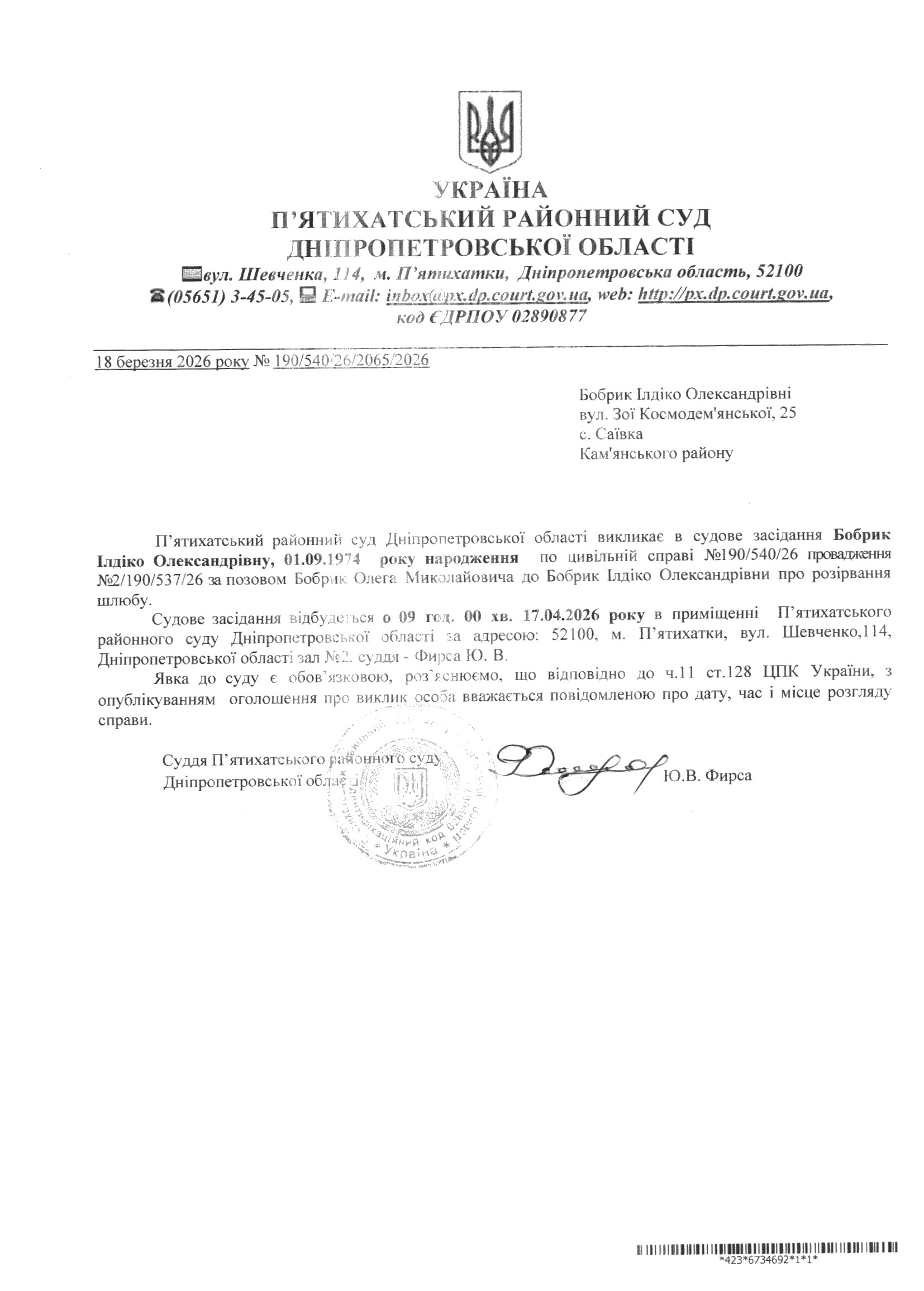 Про виклик в судове засідання Бобрик Ілдіко Олександрівна