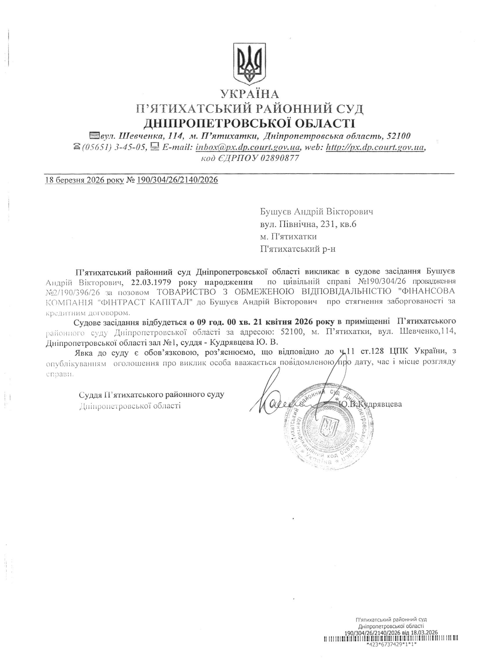 Про виклик в судове засідання Бушуєв Андрій Вікторович