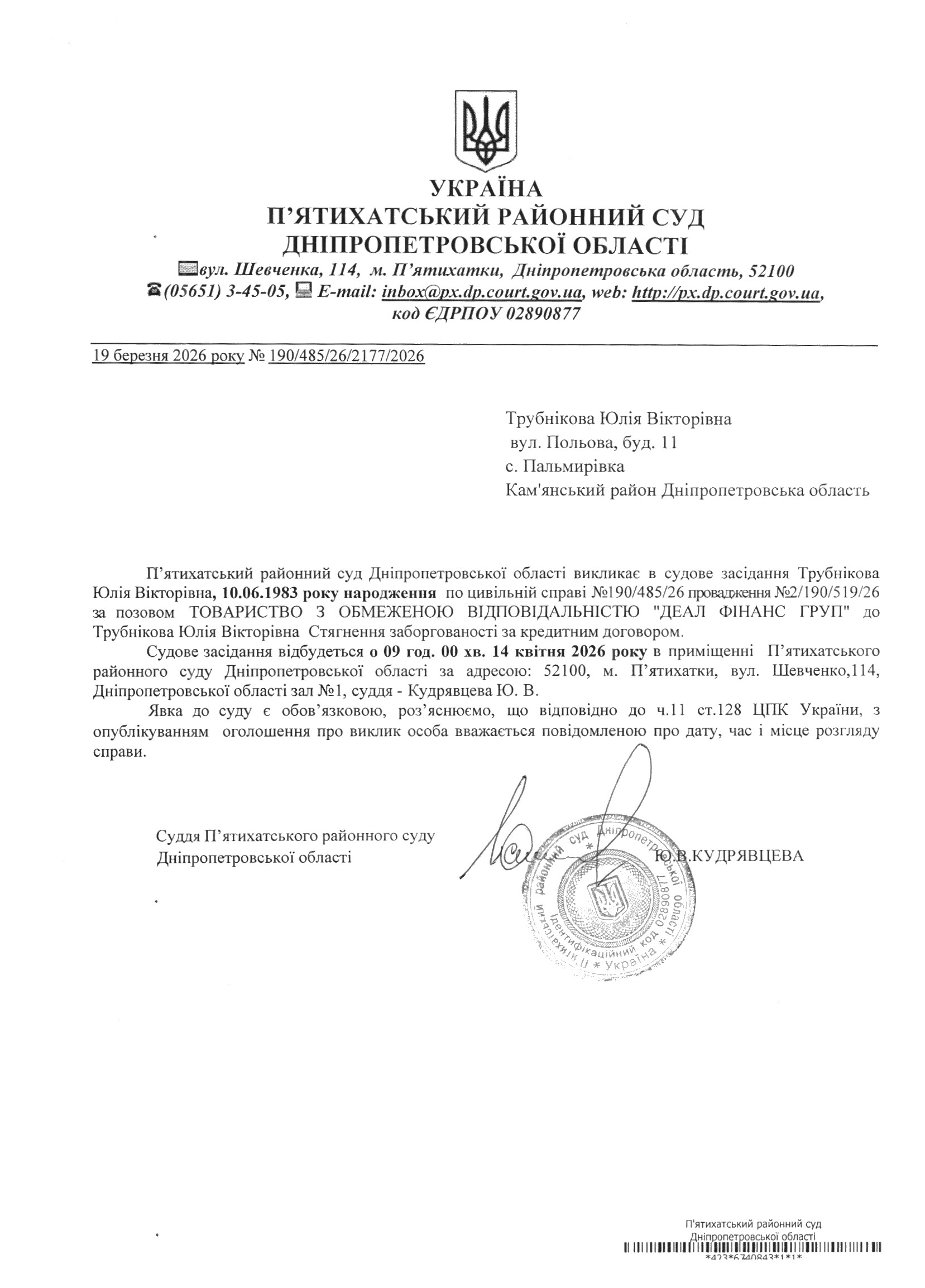 Про виклик в судове засідання Трубнікова Юлія Вікторівна