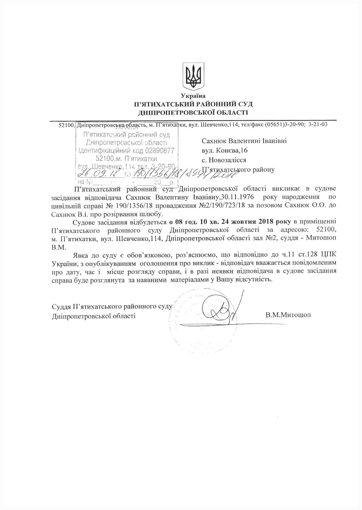 Про виклик в судове засідання Сахнюк Валентину Іванівну