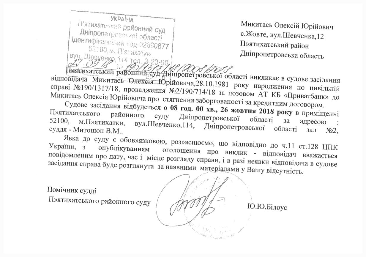 Про виклик в судове засідання Микитась Олексія Юрійовича