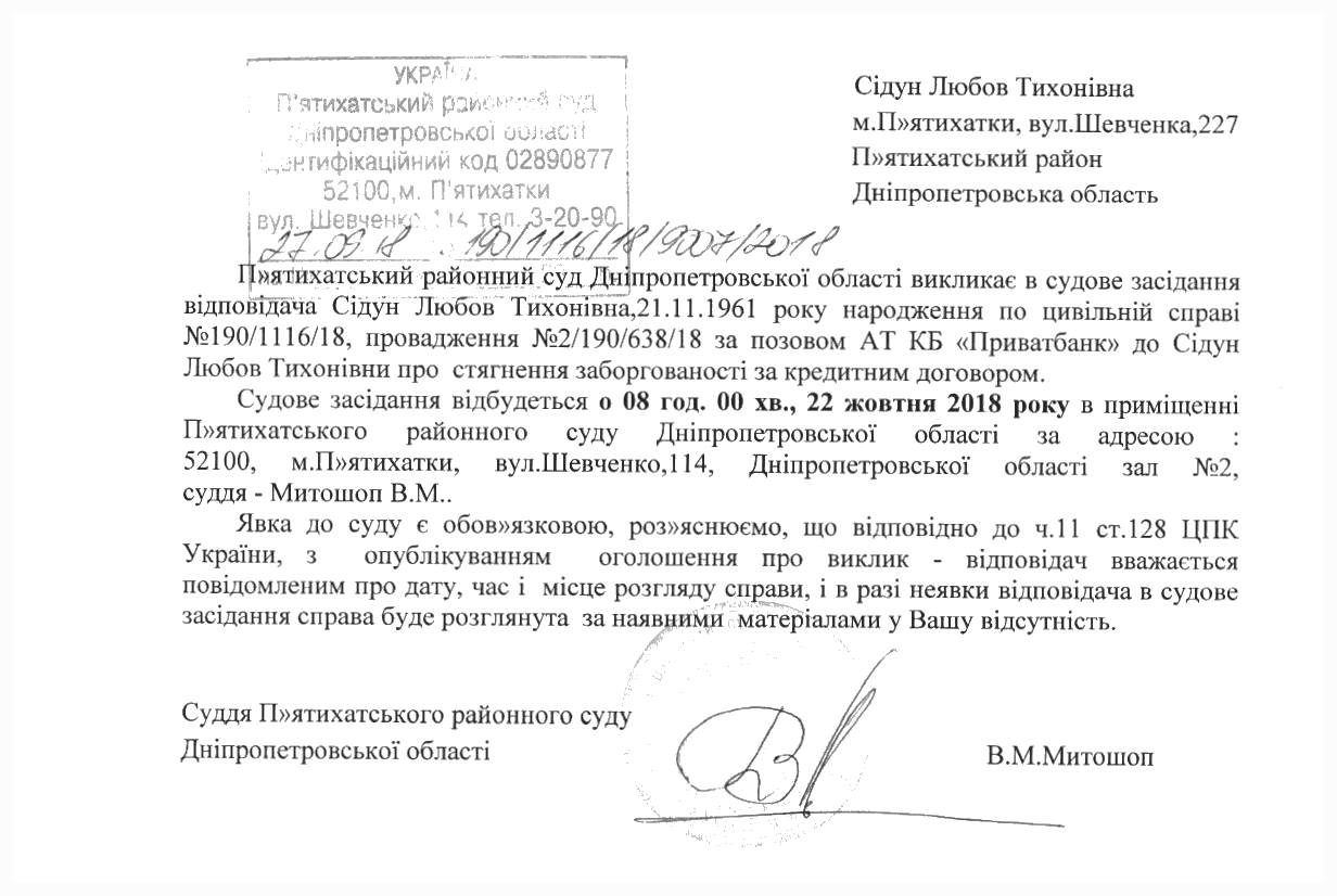 Про виклик в судове засідання Сідун Любов Тихонівну