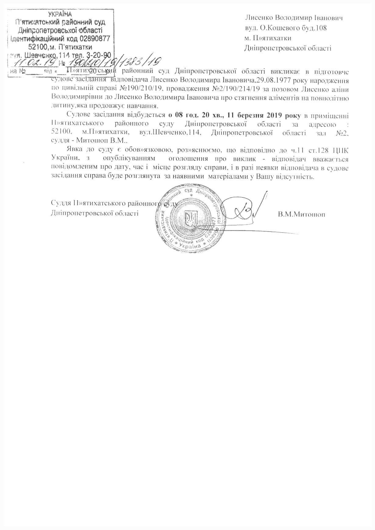 Про виклик в судове засідання Лисенко Володимира Івановича