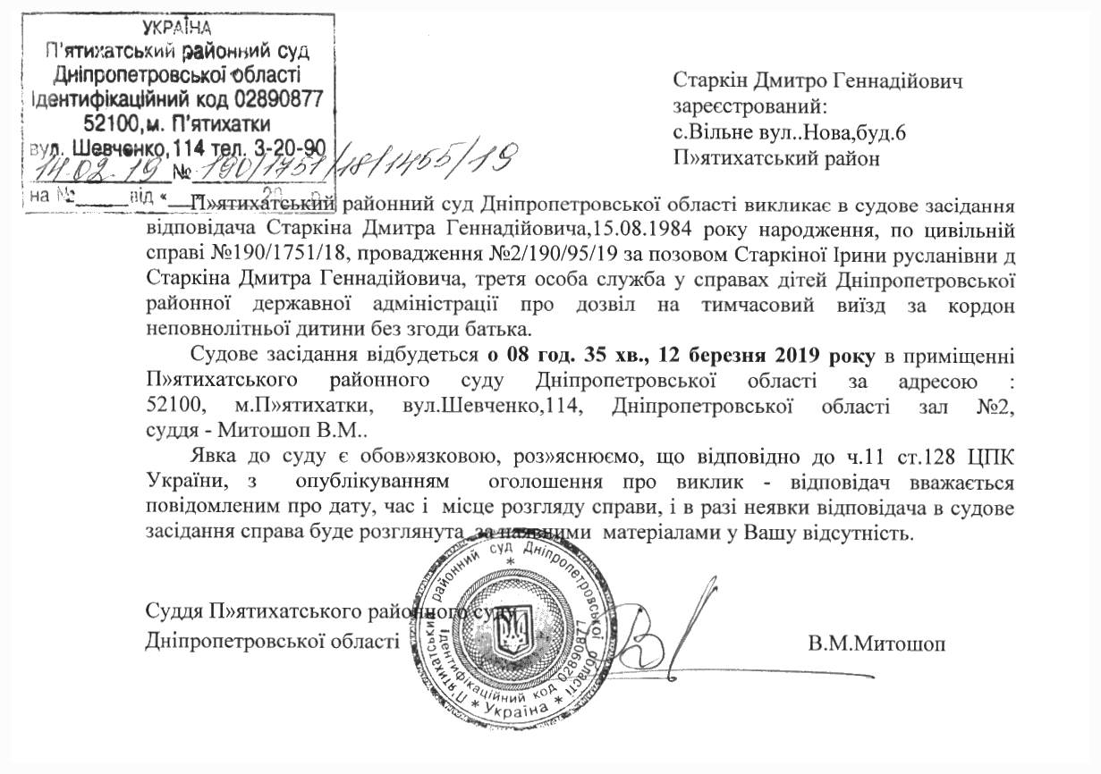 Про виклик в судове засідання Старкіна Дмитра Геннадійовича