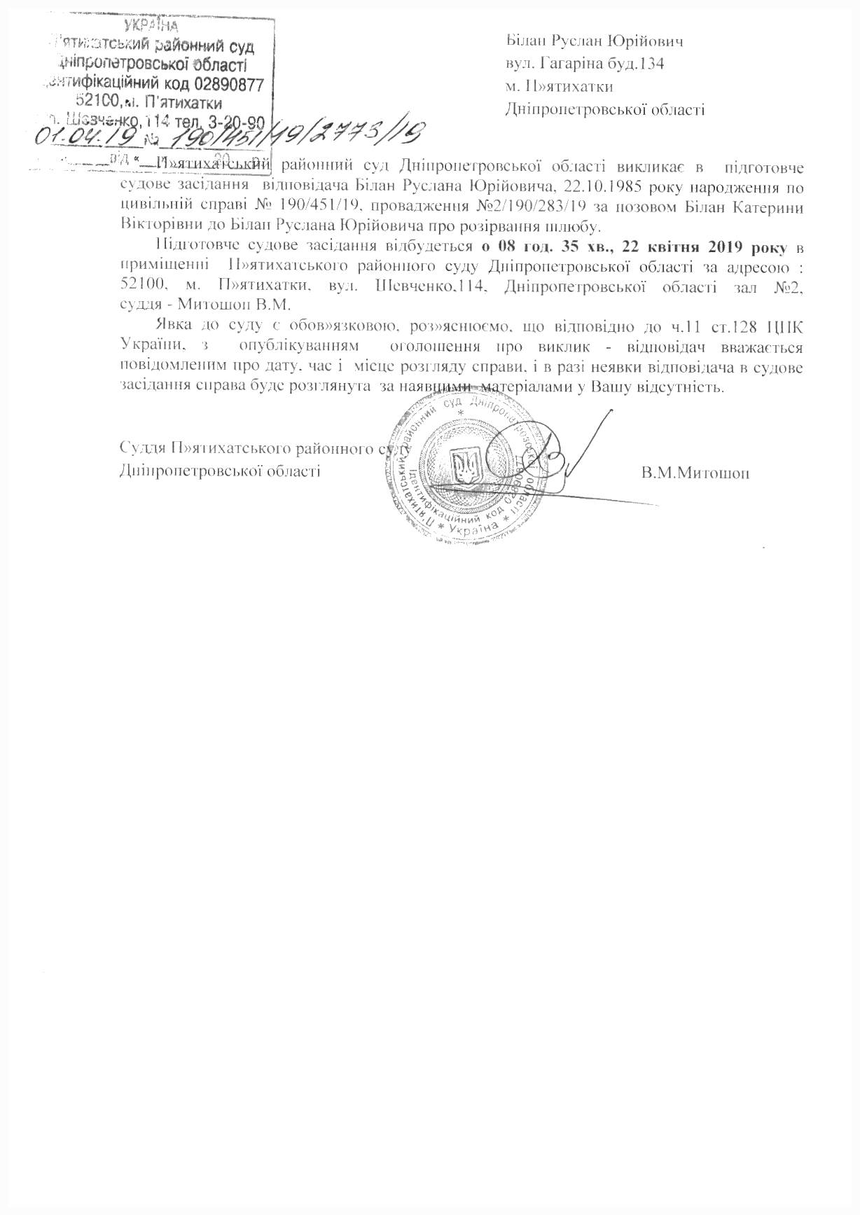 Про виклик в судове засідання Білан Руслана Юрійовича