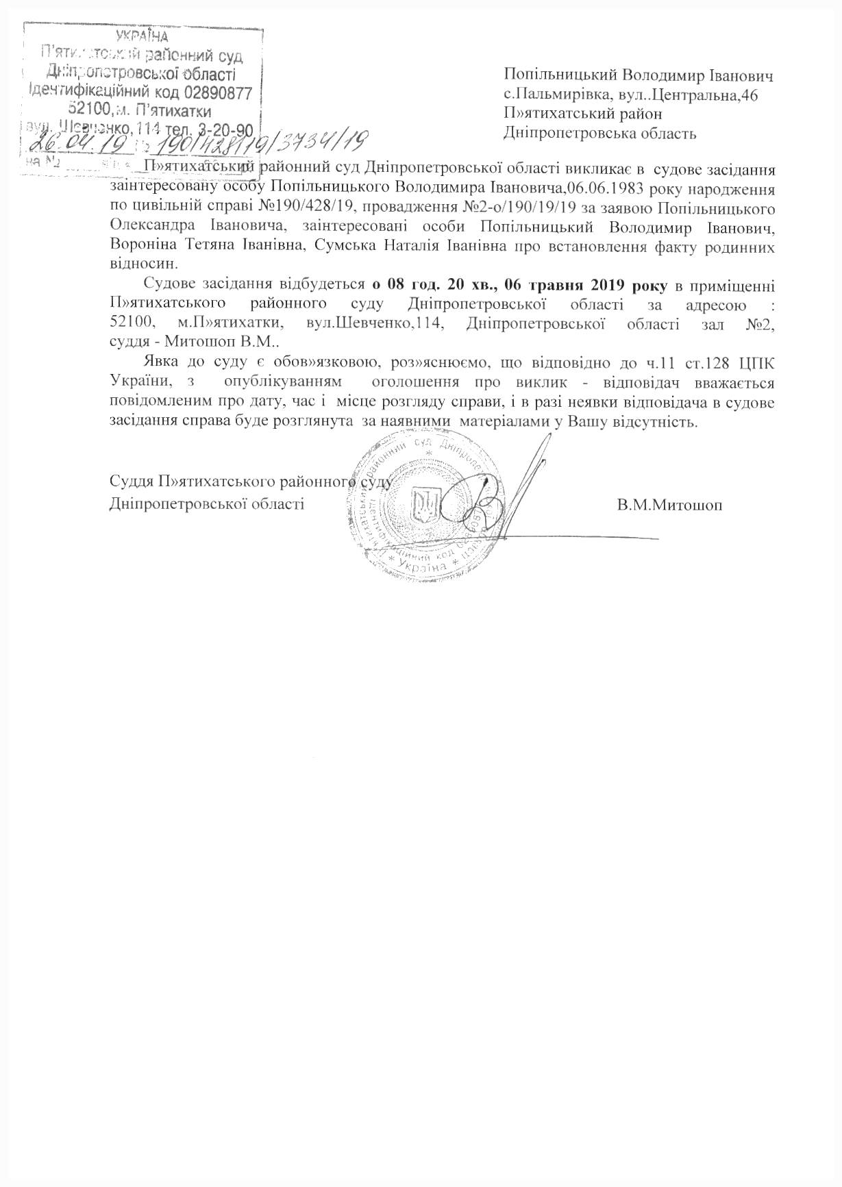 Про виклик в судове засідання Попільницького Володимира Івановича